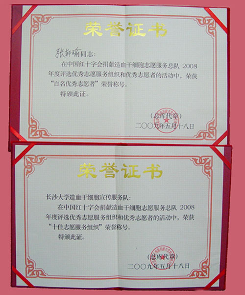 中华骨髓库第二届年会近日在北京落下了帷幕,年会表彰了2008年全国10支成绩突出的服务队和100名优秀志愿者。我校造血干细胞宣传服务队以其出色的志愿服务成绩荣获2008年度全国"十佳志愿服务组织"称号;我校志愿服务队负责人张轩瑜作为湖南省内唯一的学生代表,荣获全国"百名优秀志愿者"称号。