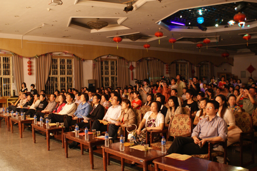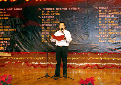 开幕式暨"中华颂"朗诵会分"重温经典"、"诵读人生"两大主题。中文与新闻传播系播音主持专业和校艺术团的同学推出了13个别具一格的节目。动人的钢琴声响起,校艺术团合唱队用经典合唱《刘海砍樵》拉开了开幕式的帷幕;雅与俗的完美结合取得了意想不到的效果。王兰君和王珂两位老师朗诵的《钗头凤》把陆游与唐婉凄美的绝世爱情演绎得淋漓尽致,凄楚动人,将开幕式推向了第一波高潮。嘉宾李兵老师应邀现场朗诵,他极富感情地为大家朗诵了《雅典的少女》和《纪念碑》两首诗,他抑扬顿挫的朗诵把大家从活动现场带到了浪漫的西方世界。最后,开幕式在激情澎湃的《东莱阁放歌》中落下帷幕。