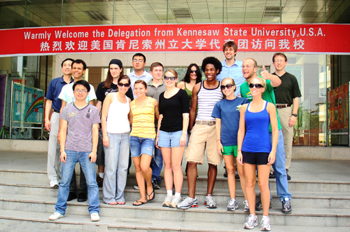 5月11日至5月18日,美国肯尼索州立大学(KSU)化学与生物系系主任Dr. Mark Mitchell和数学教授Dr.Jun Ji率学生代表团一行15人来我校进行文化交流并考察和体验中国文化。这是继2008年5月友好访问后,又一次成功的中美师生交流。