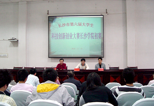 4月21日下午,长沙市第六届大学生科技创新创业大赛长沙学院初赛在我校科技楼学术报告厅隆重举行。长沙市科技局副局长胡勇、长沙市科技局社会发展处处长范建凯和我校副院长郭清泉教授、科学技术处负责人等出席大赛。