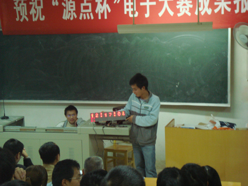 本次大赛由长沙学院教务处与湖南源点有限公司共同主办,电子与通信工程系承办。其间进行了笔试、预赛、初赛和决赛。全校共22支代表队、66人参加了比赛。谢双、钟武仁、冯昌三位同学组成的"遥控未来"队的参赛作品"红外遥控数字钟"设计新颖、功能齐全,获得大赛一等奖;陈昌友、谭海燕、李少军组成的Sunny Boy队和曾德超、吴雷、周魏同学组成的Power队分别获得二等奖和三等奖;另外有5个代表队获得本次大赛优秀奖。