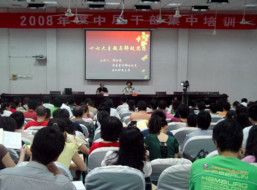 为进一步解放思想,增强廉洁从政意识、加强干部队伍廉政建设,提高做好迎接本科教学水平评估和即将进行的党建评估工作的思想认识, 7月10、11日,我校在科技楼学术报告厅举行了为期两天的集中学习和讨论,这是我校中层干部继2007年暑期集中培训之后的又一次大规模集中学习。本次集中学习形式生动,内容丰富,针对性强。省委宣传部巡视员、省社科联主席、长沙学院客座教授郑佳明,省政府督导专员、长沙医学院党委书记陈建民,市委常委、纪委书记袁观清分别从《十七大主题与解放思想》、《党建评估工作》、《认真贯彻十七大精神 着力加强反腐倡廉建设》三个专题进行针对性辅导。集中培训采取报告会和自学相结合的方式进行,校领导李咏芳、李云龙、钟惠英、宋达、邓球柏、雍正海,全体处科级干部,各基层党总支、支部委员会全体成员参与了学习。