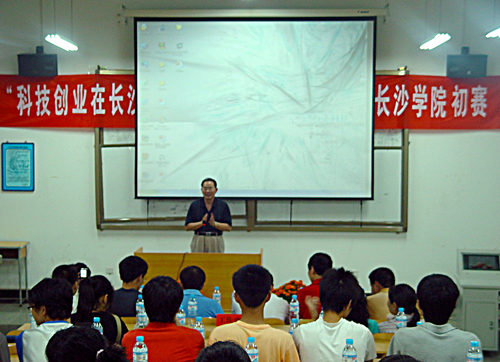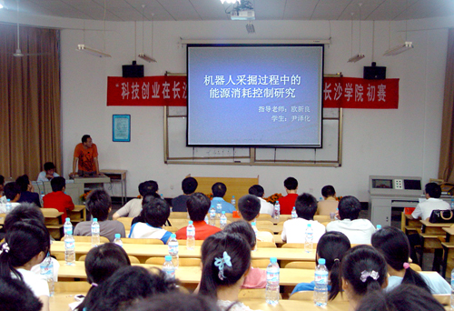 比赛伊始,我校邓球柏副院长和长沙市科技局宋新和副局长先后上台致词,希望通过此次大赛,激发我校青年的科技创新、创业热情,提高广大青年学生的科技创新、创业能力,营造创新创业的浓厚氛围,促进长沙创业之都和创新型城市建设。随后,从 14个报名者中的脱颖而出的5个项目展开了紧张激烈的对决。大赛采取参赛选手介绍项目和专家点评相结合的方式,在各参赛组对其参赛项目的特点、研究原理、实验程序、研究的必要性、目的、意义和市场前景等进行介绍和答辩后,以吴宪平教授为组长的专家组成员分别对各相关研究项目的创新性、可行性和不足之处进行点评。专家们对参赛项目给予了高度评价,并鼓励选手们再接再厉,力求更深入的研究。其中,机电工程系全宏洲等同学研究的《电壁炉测试系统的设计》已申请国家专利并投入生产,产生了巨大的经济效益和社会价值,被专家们一致认定为一等奖,充分彰显出我校大学生勇于创新、积极向上、朝气蓬勃的精神风貌。