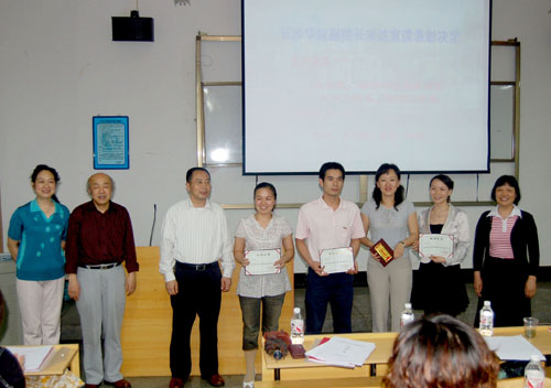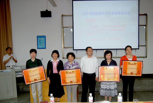 副院长宋达宣布了2007年就业工作表彰决定:外语系、机电工程系、土木工程系、法学与公共管理系被评为"2007年度毕业生就业工作先进集体";谢艳、聂志高、易方、赵琼4人被评为"2007年度毕业生就业工作先进个人"。宋达在充分肯定我校就业工作方面所取得成绩的同时,号召全体就业工作人员学习先进,为提高我校毕业生就业率与就业质量共同努力。