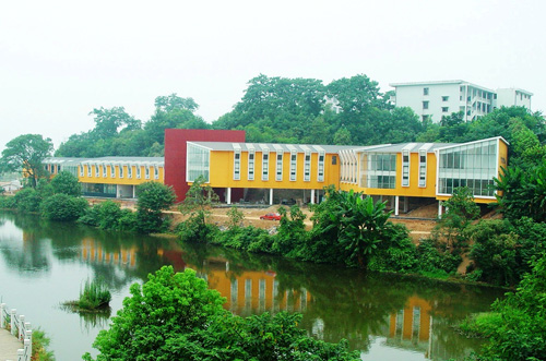 一栋别致的房子如明珠般点缀在青山绿水中,橙黄与朱红相互映衬的外墙,黑白相间的琴键形的窗户,如音符般错落有致的格局,这就是我校刚竣工的琴房。