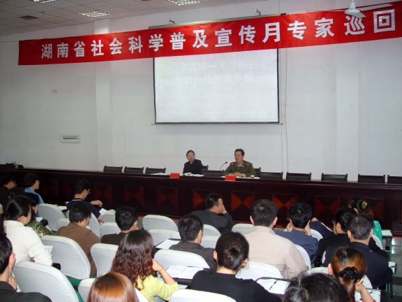 4月20日上午,湖南省社会科学普及宣传月巡回报告团在我校学术报告厅隆重举行了以“弘扬科学精神,落实科学发展观”为主题的报告会。这是报告团在全省巡回报告的第一站。全军优秀教师,国防科技大学教授,中国自然辩证法学会理事,湖南省自然辩证法研究会副理事长,国防科技大学科技委委员朱亚宗作了题为“哲学思维——无形而巨大的科技创新资源”的报告。