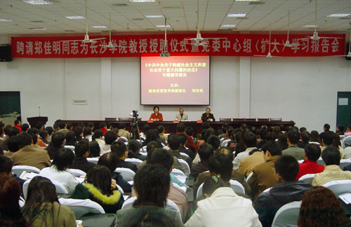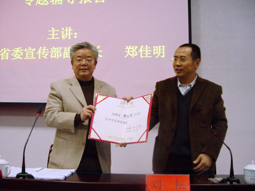 11月21日下午,科技楼学术报告厅内掌声不断,我校聘请中共湖南省委宣传部副部长郑佳明同志为兼职教授的授聘仪式暨党委中心组(扩大)学习报告会在此隆重举行。郑副部长欣然从刘耘院长手里接过教授聘书并就《中共中央关于构建社会主义和谐社会若干重大问题的决定》为我校教工党员及部分团学干部做了专题辅导。