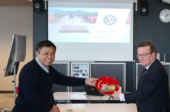 胡石明副校长向芬兰塞纳约基应用科技大学赠送纪念品