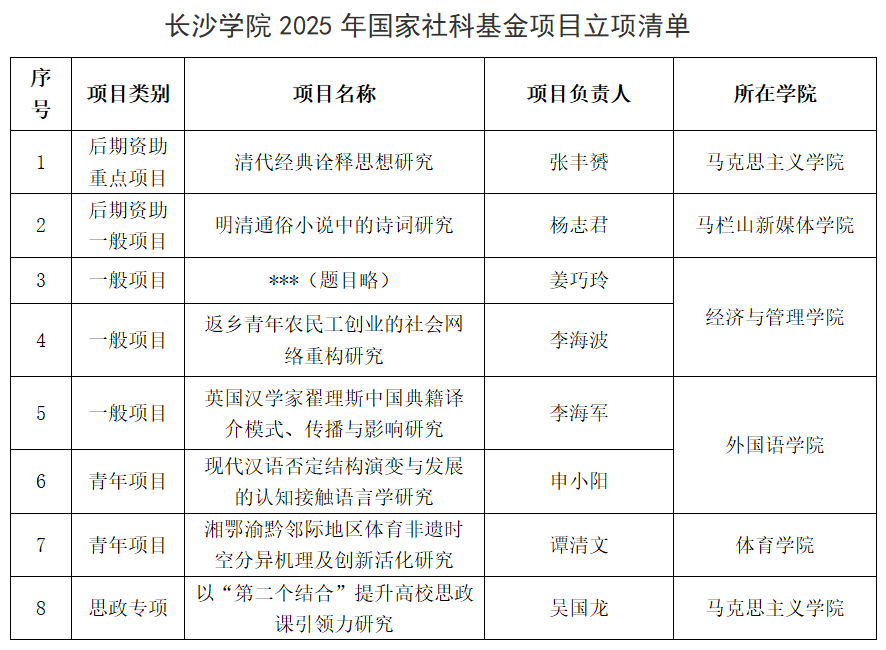 近日,2025年国家社科基金各类项目结果揭晓。我校共有8个项目获得立项资助,包含后期资助重点项目1项、后期资助一般项目1项、一般项目3项、青年项目2项、思政专项1项,立项总数与项目质量稳步提升,彰显了我校哲学社会科学研究的持续进步与良好发展态势。