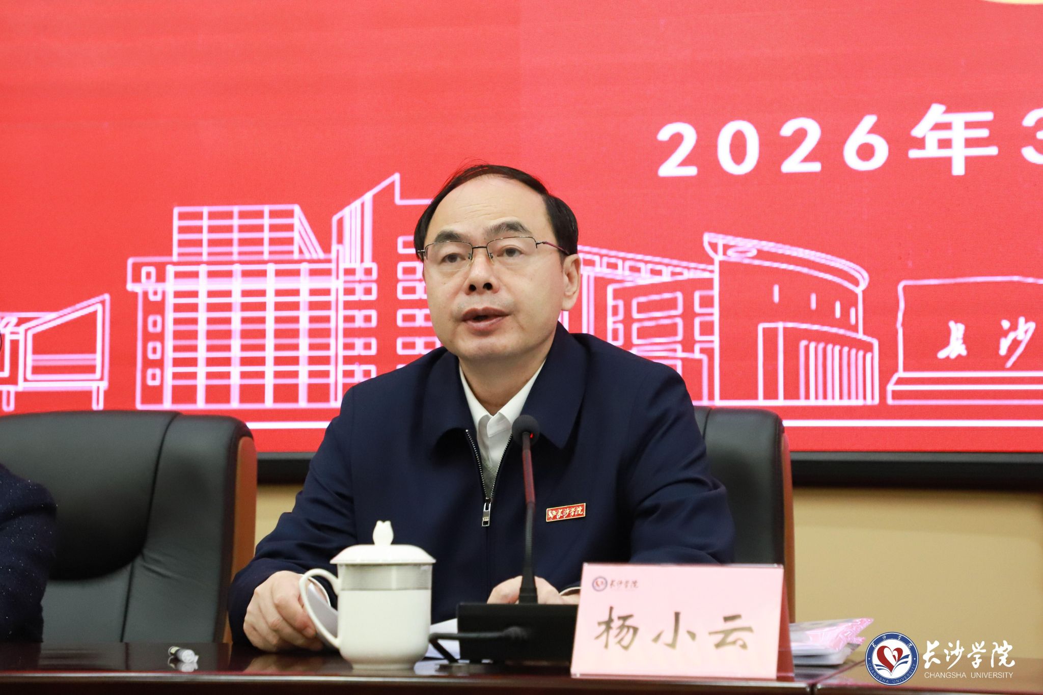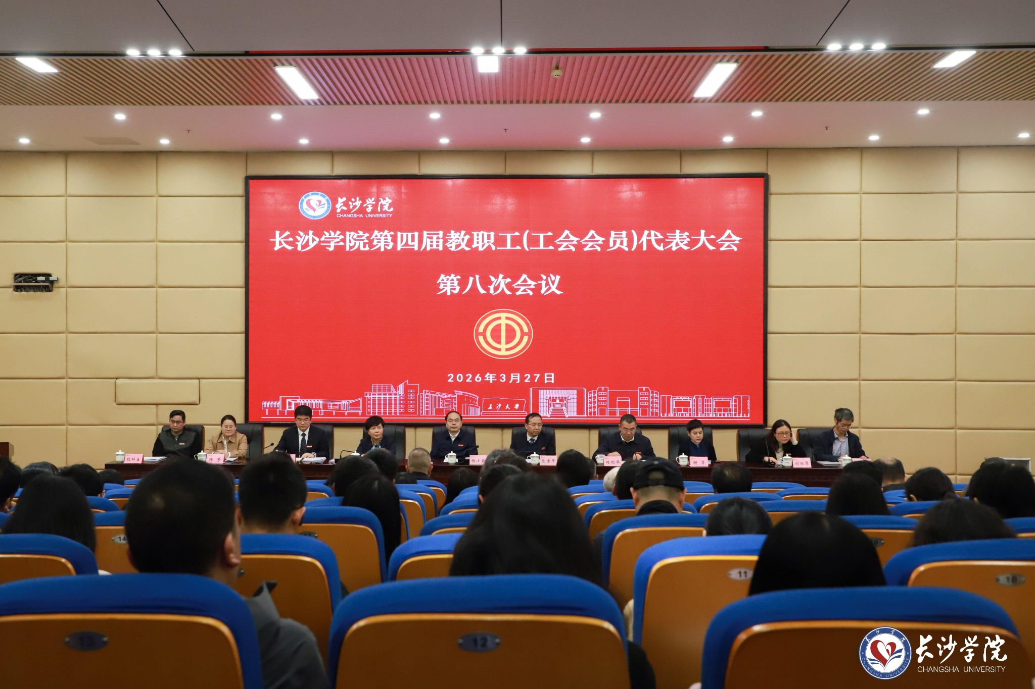 3月27日,长沙学院第四届教职工(工会会员)代表大会第八次会议在致远楼学术报告厅召开。大会听取并审议了《长沙学院工作报告》《长沙学院财务工作报告》及《长沙学院2025年财务预算执行情况及2026年财务预算建议》《长沙学院专业技术职称评审实施办法(修订草案)》《长沙学院工会工作报告》《长沙学院第四届教职工(工会会员)代表大会第七次会议以来代表提案情况的报告》。党委书记杨小云出席并讲话。全体校领导出席会议。会议由党委副书记何利华主持。