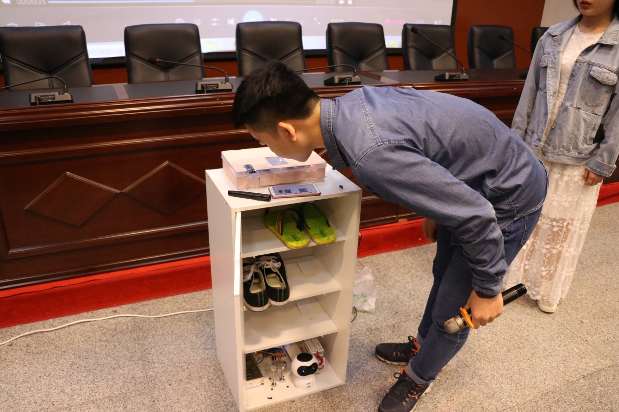 “登山手杖可以实现自拍、定位和一键呼叫?”“鞋柜可以给鞋子杀菌、抽湿、加热,还能和人智能交互?”4月8日,这些脑洞大开的创意不仅出现在我校备战长沙市第十六届大学生科技创新创业大赛的现场,还在参赛选手们的演示中变成了现实。当天下午,由科技处主办的长沙市第十六届大学生科技创新创业大赛长沙学院校赛决赛在致远楼学术报告厅举行,15支参赛队伍激荡脑力、一决高下。副校长胡石明,长沙市科技局总工程师盛湘饶、政策法规处副处长张婷出席活动。
