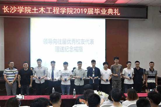 典礼上,土木工程学院2019届各毕业班班长为各班主任和班导献上了纪念礼物。在悠扬的音乐声里,四位毕业生代表带来了朗诵节目《致恩师》,全体毕业生起立,向恩师鞠躬行谢师礼。随后,胡石明向往届优秀校友代表赠送土木工程学院定制的纪念戒指,校友们再把这份鼓励与期望传递给了2019届毕业生,为学弟学妹们赠送了毕业戒指。