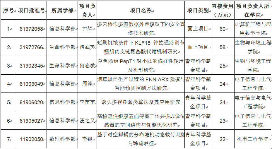 从校内学院分布看,电子信息与电气工程学院获得国家自科基金项目3项,生物与环境工程学院获得国家自科基金项目2项,机电工程学院、计算机工程与应用数学学院各获得国家自科基金项目1项,分布广泛。