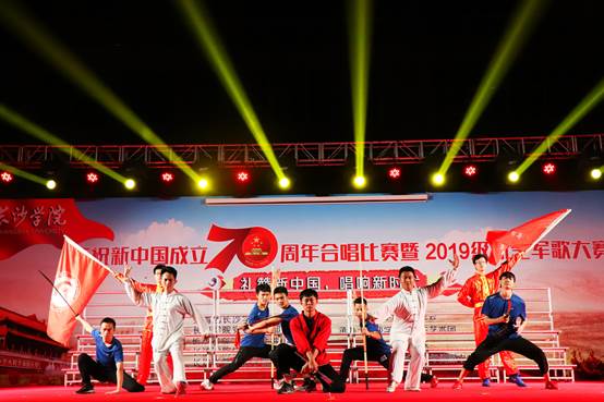 武术协会带来的串场表演《武舞生威》用千年的文化传承——武术,一展中华儿女雄姿英发,剑啸苍穹、气贯长虹的武术表演让现场的气氛又掀起一波浪潮。音乐学院的彝族群舞传递着对祖国的《情深谊长》,翩翩舞姿赢得了现场观众的阵阵掌声。倾情献唱的压轴歌曲《迎风飘扬的旗》用最真诚和嘹亮的歌声向祖国致敬与祝福。