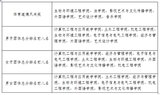 本次运动会历时两天,共设20项竞赛项目。其中,男子项目12项,女子项目12项,集体项目6项,体育文化节项目分为体育摄影和桥牌比赛。我校11个二级学院代表队共计1502名运动员参加了比赛。经过激烈的角逐,计算机工程与应用数学学院代表队分别以133分、119分、374分的骄人成绩斩获男子团体、女子团体、男女团体总分第一名,并刷新了去年的总分记录。生物与环境工程学院、法学院、影视艺术与文化传播学院、外国语学院、艺术设计学院、音乐学院荣获体育道德风尚奖。