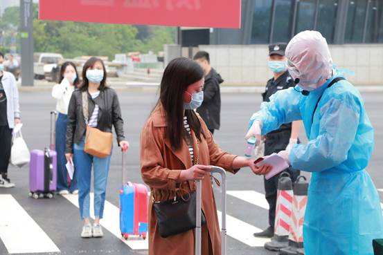 演练共设置学生入校、医护应急、学生就餐、学生入寝、师生入教室上课等五个环节。其中,在报到入校环节,由工作人员扮演的返校学生们在主校门外保持间隔1米以上排队依次进行体温测量,体温无异常且核验过所有报到指定手续的学生方能进入消杀区,继续后续报到程序。一名“学生”因测量体温超过了37.3℃,被工作人员带往预检分诊点进行体温复测、症状问询等预检分诊程序。