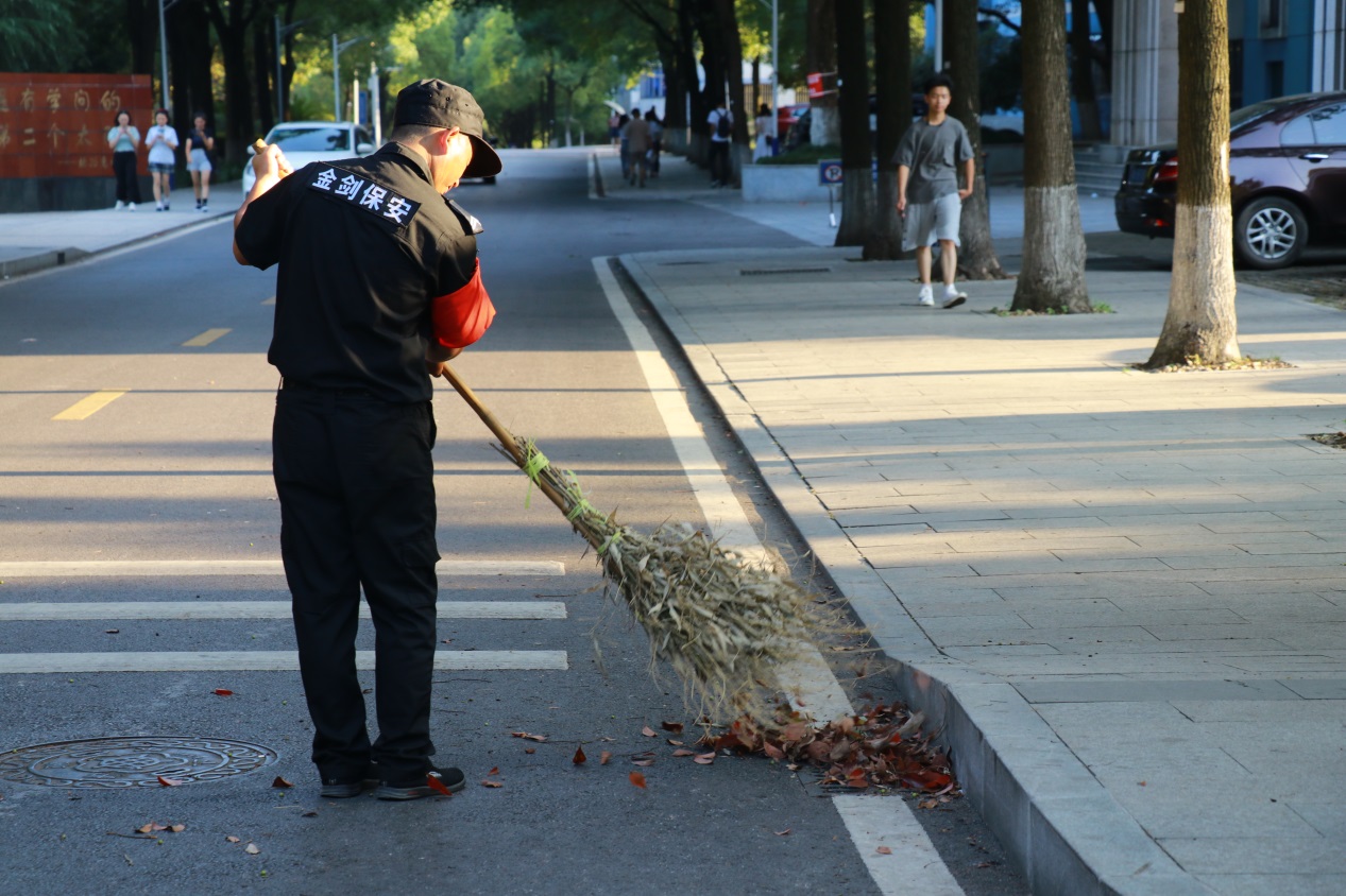 (9月1日傍晚,一名保安协助后勤工作人员保持校园卫生。)