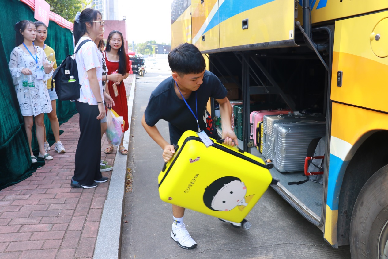 校门口,学校特意安排了接驳大巴。学生进入校园后,可以乘坐免费的接驳大巴往返校内各个宿舍园区,避免在烈日下携带大件行李徒步行走。大巴车旁,一个个忙碌的身影,为乘车的同学认真码放行李。电信学院2019级罗同学便是其中一员。“我是校学生会的一员,8月30日就回来了,来给后面返校的同学做志愿服务。上岗前,校团委已经给我们做了个人防护安全培训。能为同学们服务,我觉得很荣幸。”他说。