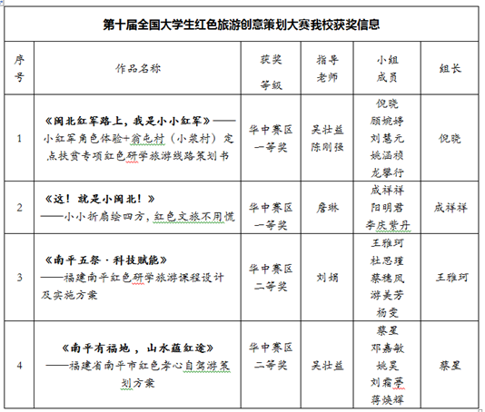 附:第十届全国大学生红色旅游创意策划大赛我校学生获奖名单