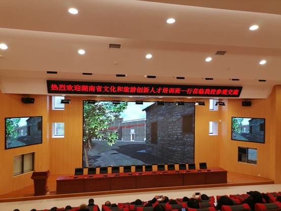 12月16日上午9点-11点,湖南省文化和旅游厅举办的“湖南省文化和旅游创新人才培训班”由科技教育处副处长黄俊晶、副调研员赵小龙率队来校开展现场教学。培训班学员共70名,由湖南省地级市文化和旅游局领导以及文化旅游企业负责人组成。本次现场教学活动由经济与管理学院牵头,联合艺术设计学院、创新创业学院、乡村振兴研究院一起完成的一次活动,同时也得到学校领导以及后勤处、保卫处等相关部门的大力支持。