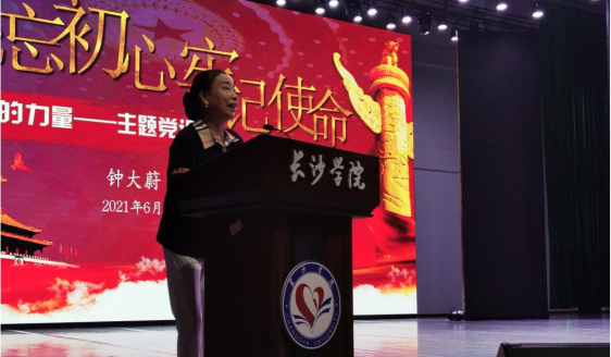 第二场报告会主题是“信仰的力量——主题党课”,由韶山杨林乡“一门三忠烈”钟氏三兄弟的后人钟大蔚主讲,分享了她所了解的爷爷辈的英雄事迹和自己追求入党的心路故事。当同学们听到钟氏三兄弟在毛主席亲自教导下加入了中国共产党,积极投身革命壮烈牺牲的故事后,无不动容。钟主任在报告会上再读入党誓言,并激昂表态“作为一名韶山中共党员的后代,一个受党培养教育多年的退休干部,一定会更加坚定不移地跟党走,传承红色基因,为实现中华民族的伟大复兴继续奉献自身的余热,为党的事业奋斗终身!”话音刚落赢得场上阵阵掌声,同学们纷纷表示,报告会让他们对党的百年辉煌历史有了更加深入的了解,对党的初心使命有了更加深刻的认同,对党的理想信念有了更加坚定的追随,对党的伟大事业有了更加奉献的动力。
