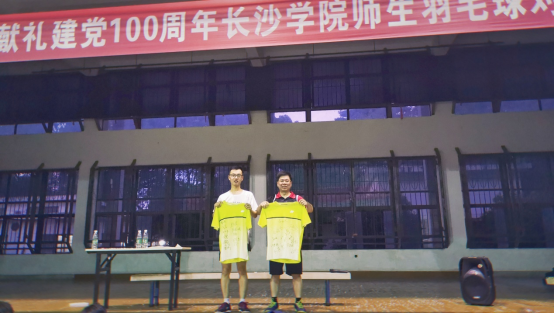 党委委员、副校长、教工羽毛球协会会长祝磊与学生代表互赠签名球衣