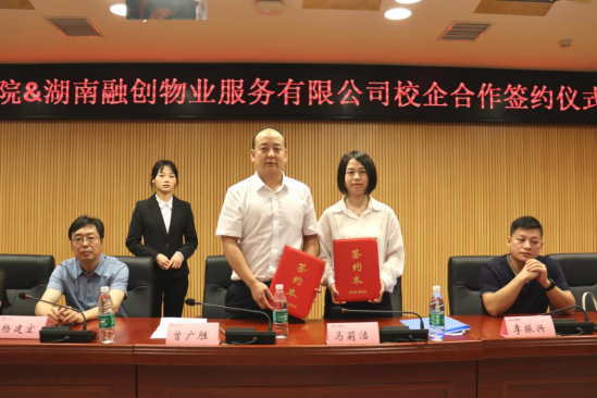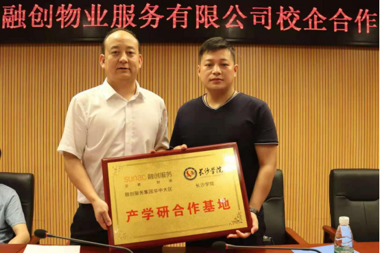 副校长曾广胜和总监马莉洁分别代表长沙学院和湖南融创物业服务有限公司签署校企战略合作协议。高级经理李振兴与副校长曾广胜共同为产学研合作基地揭牌。