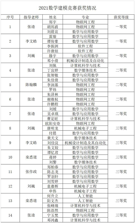 10月9日,2021年湖南省大学生数学建模竞赛暨全国大学生数学建模竞赛湖南赛区比赛评审结果揭晓,我校计算机工程与应用数学学院参赛队伍喜获省一等奖3项,省二等奖4项,省三等奖7项。