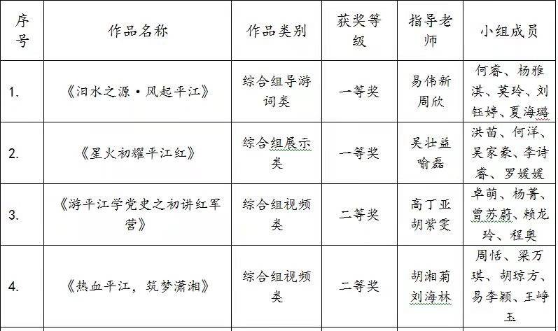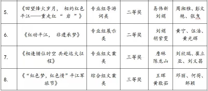易伟新、周欣老师指导的综合组导游词类作品《汨水之源·风起平江》和吴壮益、喻磊老师指导的综合组展示类作品《星火初耀平江红》,分别获得所属赛道的最高分,荣获一等奖。《汨水之源·风起平江》以“文化+旅游”作为突破口,围绕非遗传承、红色传奇、缤纷美食三个元素,用系列短视频的形式创新性地展示了“激情山水、自在平江”的文旅特色。《星火初耀平江红》则立足于湖南平江红色文化,创造性地以国潮风插画为表现形式, 融入时代特色,在一系列原创“红色插画”的基础上,还为景区量身打造了覆盖吃、住、行、游、购、娱各个方面的独家文创产品,并将部分产品制出实物,最终获得专家评委的青睐。