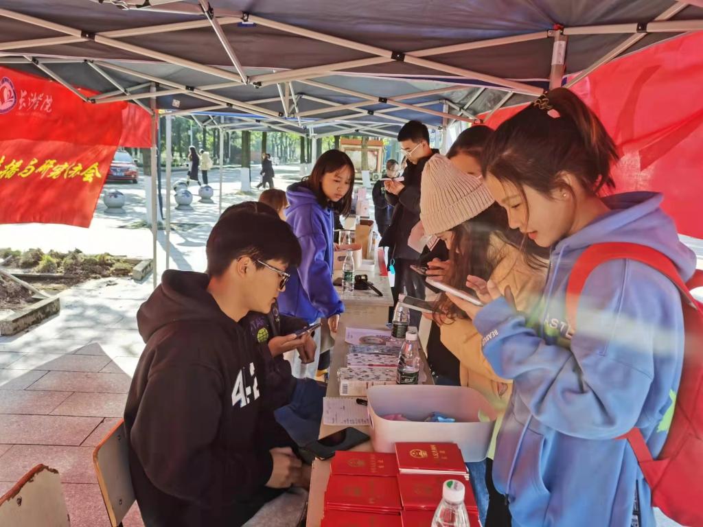 12月4日,在指导老师的带领下,法学院法学传播与研究协会紧扣主题,利用电子显示屏开展了《中国宪法》纪录片循环播放宣传,通过平台宣传、展板展示、有奖竞答、现场讲解、发放资料等形式积极宣传《中华人民共和国宪法》等法律法规知识,以提高同学们对相关法律法规的知晓度,促进同学们自觉学法、守法、用法。据统计,活动中宣传者共发放资料两百余份、接待同学近四百人。