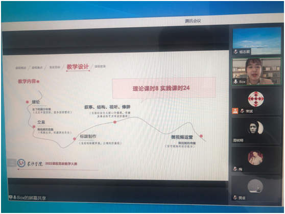 本次活动分为两个阶段,首先进行的是课程思政院级选拔赛。按照赛前视频抽签的顺序,播音与主持艺术专业的黎鲁蒙老师、广播电视编导专业的梁湘梓老师、新闻学专业的朱珊老师、影视摄影与制作专业的曾雨欣老师、汉语言文学专业的谭真明老师、影视摄影与制作专业的王银洁老师依次进行了10分钟现场说课、5 分钟课堂教学展示和5 分钟现场答辩。评委根据选手的课堂教学设计和现场表现在线进行了评审,其中黎鲁蒙、梁湘梓、曾雨欣荣获一等奖代表学院参加学校比赛,朱珊、王银洁荣获二等奖,谭真明荣获特别奖。赛课之后,各教研室结合本次选拔赛,围绕“如何实施春风化雨育人无声的课程思政和提高在线教学质量”分别开展了云端研讨活动。