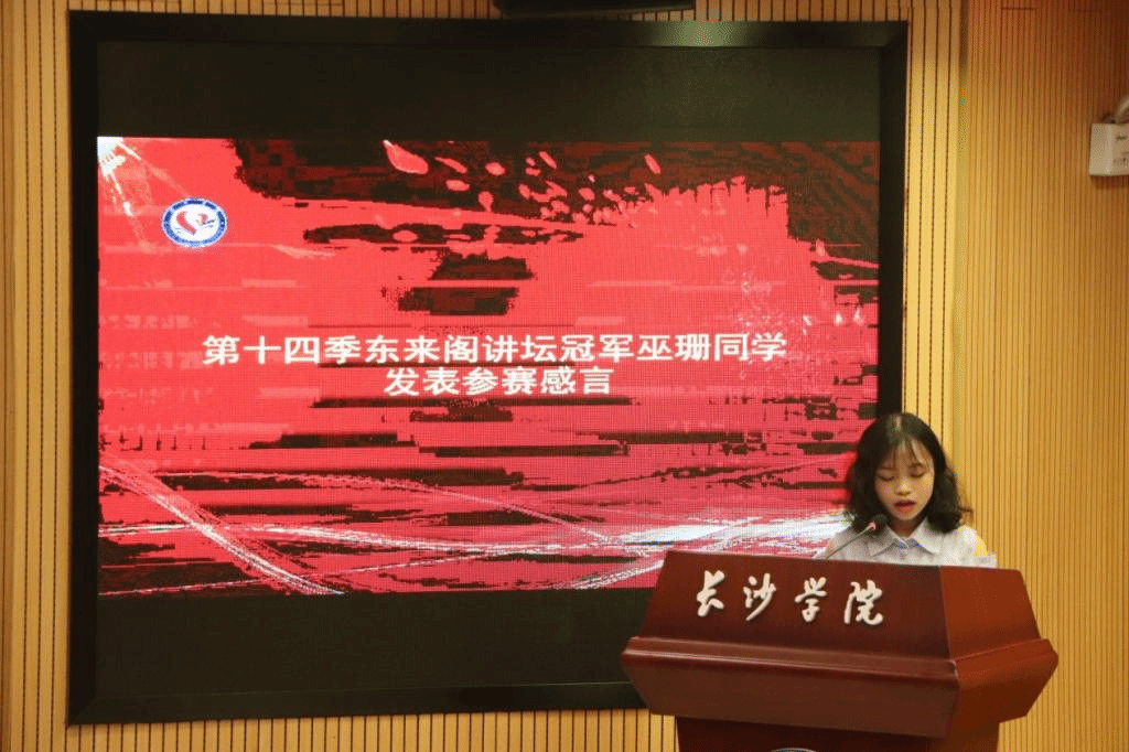 来自马栏山新媒体学院的巫珊同学作为第十四季讲坛冠军队代表发表参赛感言,她表示“东来阁讲坛”主题丰富多彩,它不仅仅是竞争性的比赛,更像一场春日会友,它引导我们从中汲取正视自我、面对时代的力量。