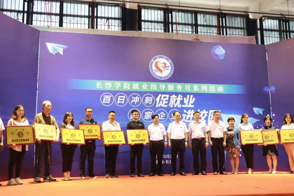 学校校领导为正大食品、蓝思科技集团等11家企业授予“长沙学院就业实习实践基地”牌匾。随后,正大食品中南片区业务主管柳鹏飞作为企业代表发言。他代表各接牌企业向开福区政府及长沙学院领导表达感谢,表示企业将加强与学校的合作,在追求企业自身发展的同时也让毕业生得以实现自身的价值。