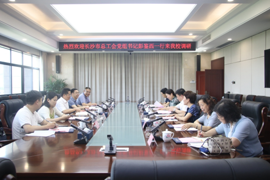 6月14日下午,长沙市总工会党组书记、副主席彭鉴西,党组成员、副主席黄渐坤一行来校调研。党委副书记、工会主席汤文胜主持调研座谈会,党委委员、纪委书记丁文参加了调研。