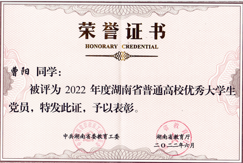近日,中共湖南省委教育工委、湖南省教育厅下发《关于评选表彰2022 年度湖南省普通高校优秀大学生党员的通知》(湘教工委通〔2022〕14 号),我校曹阳、黄玉兰两位同学被授予“2022年度湖南省普通高校优秀大学生党员”荣誉称号。