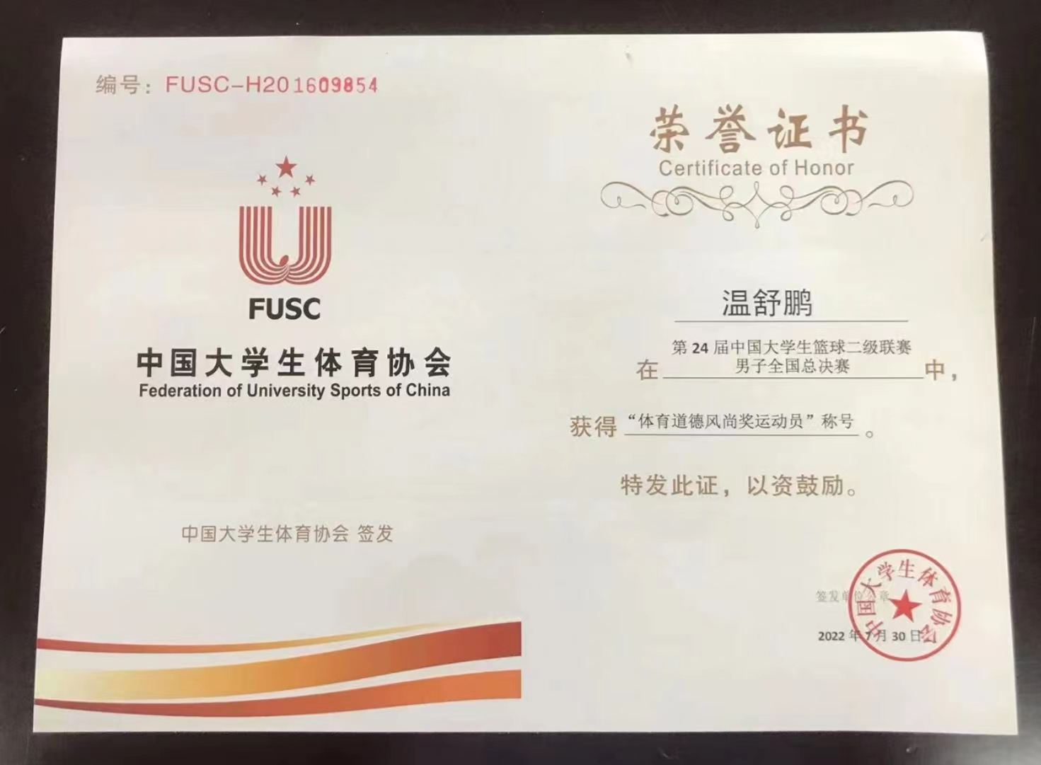 7月30日,在山西工商学院举行的第24届中国大学生篮球(CUBA)二级联赛男子全国总决赛落下帷幕,我校篮球队获得体育道德风尚奖,计算机科学与工程学院2019级学生温舒鹏获得体育道德风尚奖运动员称号。