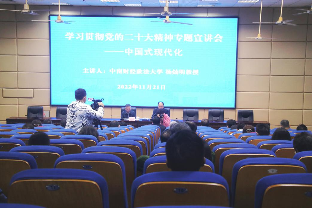 11月21日下午,我校在致远楼学术报告厅举行“学习贯彻党的二十大精神——中国式现代化”专题宣讲会,中南财经政法大学杨灿明教授主讲。宣讲会由党委副书记、校长黄立宏主持,在校校领导、党委委员,全体中层正职,党总支副书记,马克思主义学院全体教师、全体辅导员及部分学生代表参加了宣讲会。