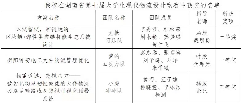 湖南省第七届大学生现代物流设计竞赛自启动以来,我校积极组织校内选拔赛,最终汤毅、戴恩勇老师指导的“无糖可乐队”、叶欣、全春光老师指导的“梦的五次方队”和杨威、余冰老师指导的“小虎冲冲队”三支队伍突出重围,代表学校参赛。经过初赛、复赛和决赛三个阶段,我校三支参赛队伍一路过关斩将,最终获得优异成绩。