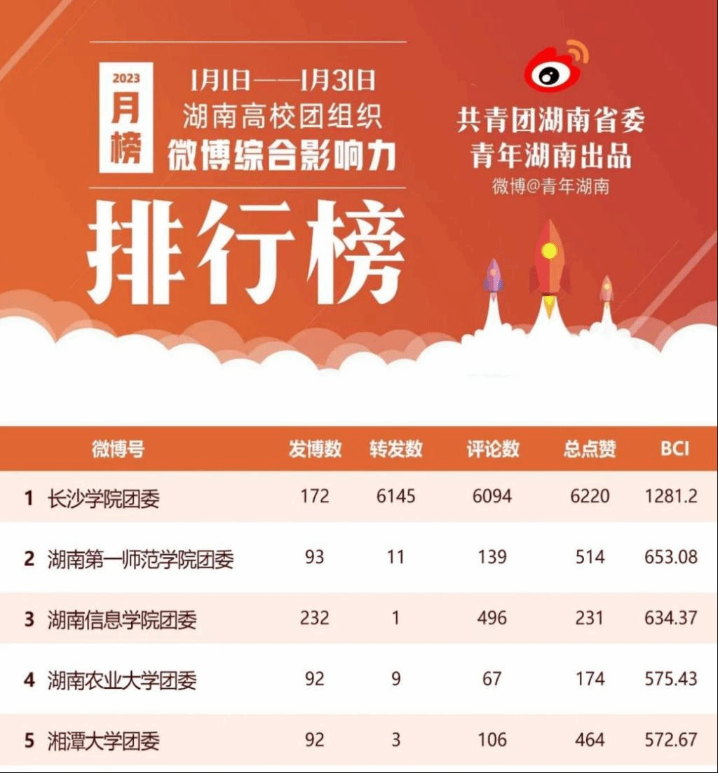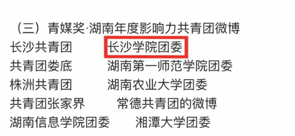 近日,由中共湖南省委网信办、共青团湖南省委联合举办的“携手青媒,网聚能量”湖南省青媒奖主题活动结果揭晓,我校共青团微博“长沙学院团委”在2022湖南高校团组织微博综合影响力排行榜中多次排名第1,在全国高校团委校园V影响力榜单中多次排名前10,获评2022年度“青媒奖·湖南年度影响力共青团微博”,这也是我校团委连续3年获评此项荣誉。