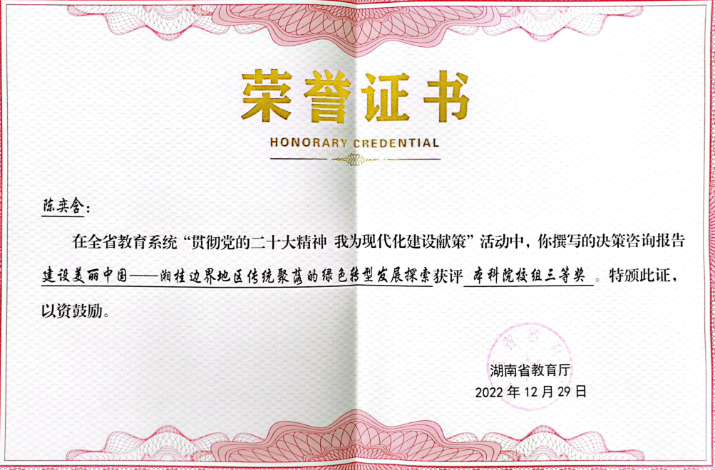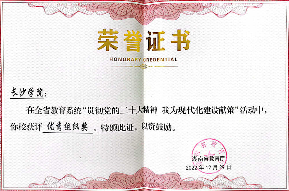 为深入学习宣传贯彻党的二十大精神,我校根据相关文件精神,积极组织全校师生参与了省市学习宣传贯彻党的 大精神的一系列活动,由湖南省教育厅组织的“贯彻党的二十大精神 我为现代化建设献策”活动是其中之一。学校紧抓机遇,通过动员部署、组团选题、合作研究、专家指导等一系列有组织的科研活动,着力推动了学校新型智库研究,并向省教育厅择优报送了10项决策咨询报告,本次获奖的2项成果即源于此,另有多项成果获得好评。