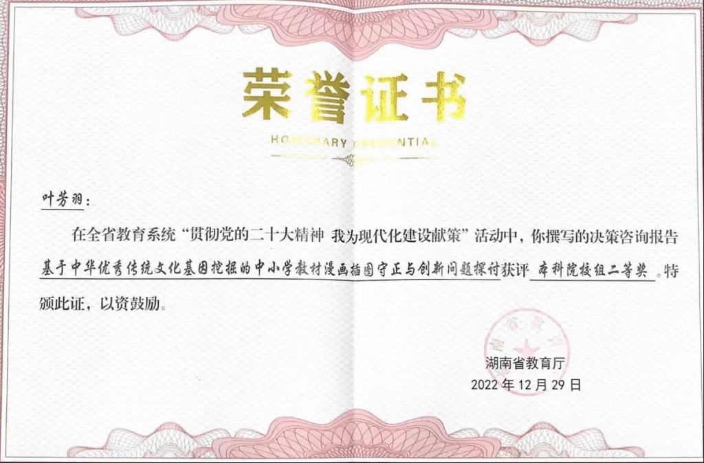 近日,湖南省教育厅公布了“贯彻党的二十大精神 我为现代化建设献策”活动评审结果,我校2项智库研究成果获奖,其中,经济与管理学院叶芳羽博士的成果《基于中华优秀传统文化基因挖掘的中小学教材漫画插图守正与创新问题探讨》获二等奖,艺术设计学院陈奕含老师的成果《建设美丽中国——湘桂边界地区传统聚落的绿色转型发展探索》获三等奖。学校荣获优秀组织奖。