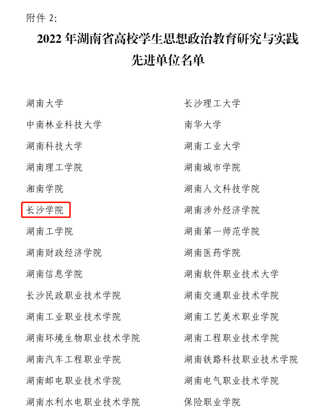 我校获评湖南省高校学生思想政治教育研究与实践先进单位;曾喆、陈昊获评湖南省高校辅导员工作研究与实践先进个人;林涵、谭凤连获评湖南省高校学生思想政治教育研究与实践先进个人;徐远超、向伟、赵娅撰写的论文《新时代高校辅导员心理育人的困境、原因及对策》获评湖南省高校辅导员优秀论文;李璇撰写的案例《创新文化协同培养体系,优化社会实践育人模式——以通道筑梦社会实践团为例》获评湖南省高校学生思想政治教育优秀育人案例。