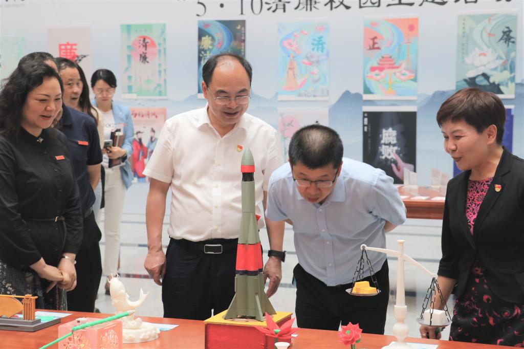 会后,肖汉学调研了我校清廉校园建设工作,对我校清廉校园建设工作成效和经验做法给予了充分肯定。调研中,肖汉学详细了解学校第二届“5·10清廉校园主题活动周”开展情况,参观了“清廉空间”及我校师生共同创作的清廉主题书签、海报、剪纸、3D打印作品等。