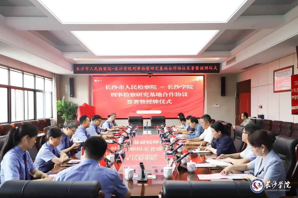 6月11日上午,我校与长沙市人民检察院共建刑事检察研究基地合作协议签约仪式在长盛楼4001会议室举行。我校校长陈赤平,党委委员、副校长张世英,党委委员、纪委书记丁文,长沙市人民检察院党组书记、检察长余湘文,副检察长廖耀群出席签约仪式,我校和市检察院相关部门负责人参加仪式。仪式由丁文主持。