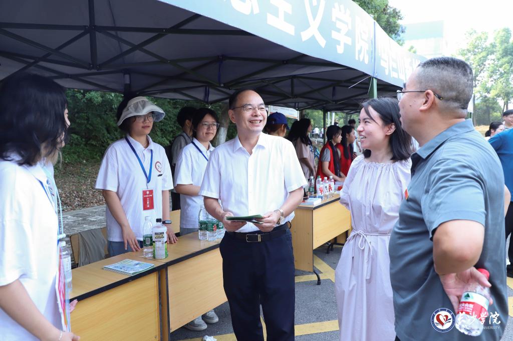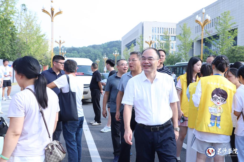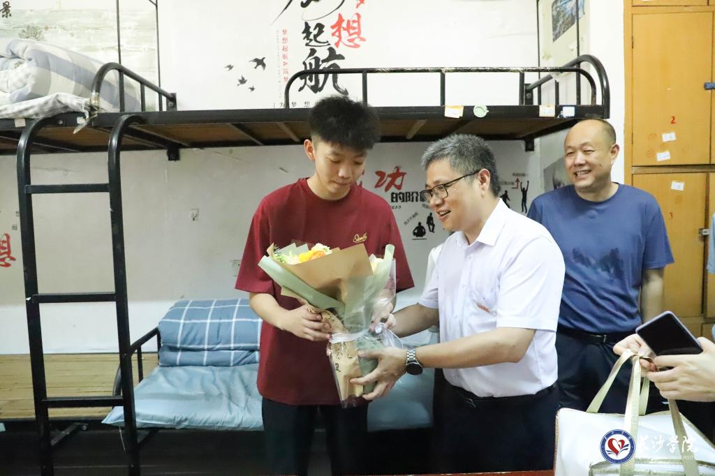 上午,党委书记杨小云,党委委员、副校长张世英、何利华带队先后来到东南门、北门、敏学园区宿舍等迎新点检查指导迎新工作,并慰问参加迎新工作的师生员工和志愿者。“你们从哪里来?”“报到过程顺利吗”“欢迎加入长沙学院!”校领导们仔细询问了新生的生源地、录取专业、生活适应性等情况,并勉励他们不负韶华,尽快适应新的学习和生活环境,以最好的状态开启新的大学生活。“生日快乐,祝你学业有成!”迎新当天还是24级网络空间安全专业陈毅航的生日,党委委员、副校长阳王东现场送上了生日祝福,让新生及家长真切感受到了学校的热情与温暖。