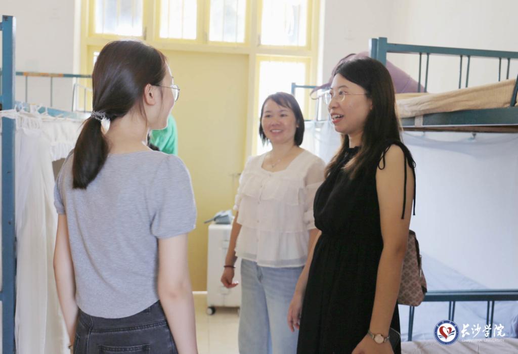 (外语学院新进教师、校友饶诗雨作为班主任在宿舍看望新生)