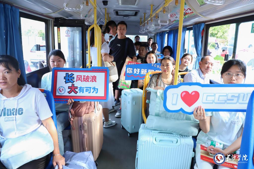 12辆迎新专用“爱心大巴”在各校门口接送新生及家长前往宿舍和报到点,帮助同学们“一键式”报到。“大巴车能把我们和行李一起送到宿舍楼下,感觉学校很贴心很周到!”24级机械设计制造及其自动化专业潘泯亦同学说。
