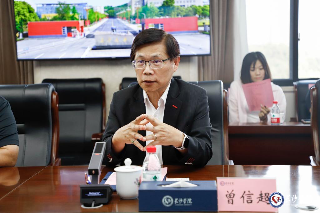 曾信超对我校的热情接待表示感谢,并高度赞赏了我校的办学实力、学生培养质量和实验实训场地建设。他表示,台湾敏实科技大学是台湾第一所专注人工智能专业的大学,在智慧车辆、智能制造、智慧餐饮等专业方向具备较强的研究基础,致力于打造小而美的优质科大。他希望通过此次参访,加强与我校在短视频制作等方面的交流合作。
