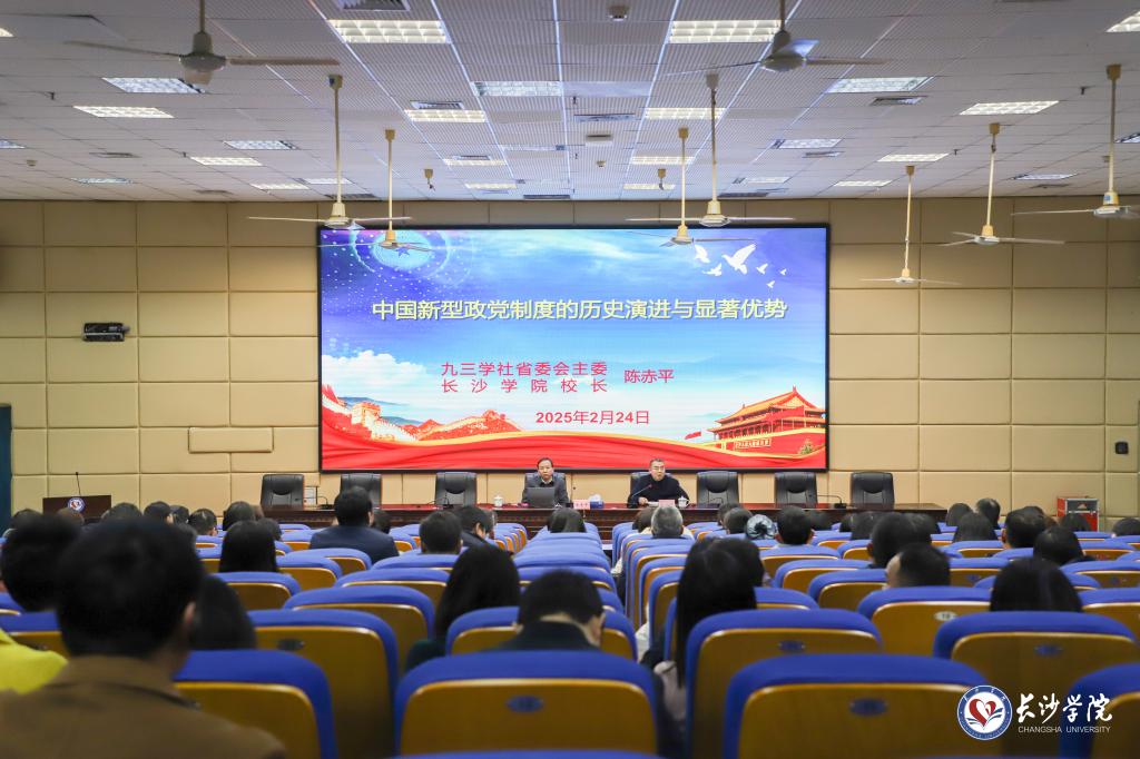 为深入学习领会习近平总书记关于坚持好发展好完善好中国新型政党制度的重要论述,进一步深化对中国新型政党制度的认识,提升党务工作者、党外人士的政治素养和履职能力,2月24日下午,九三学社湖南省委会主委、校长陈赤平在致远楼学术报告厅作《中国新型政党制度的历史演进及显著优势》专题辅导报告。党委委员、副校长、组织统战部部长何利华主持报告会。