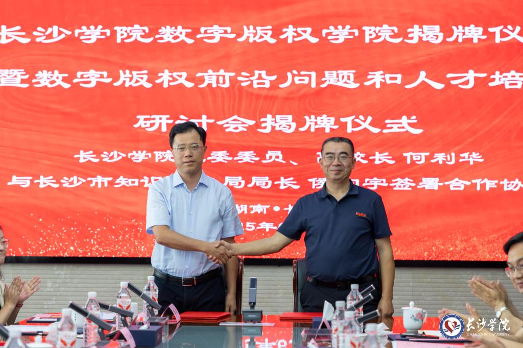 (何利华和谢勇共同为“长沙学院数字版权学院”揭牌)